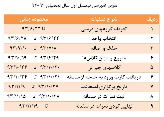 تقویم آموزشی نیمسال اول سال تحصیلی 94-93