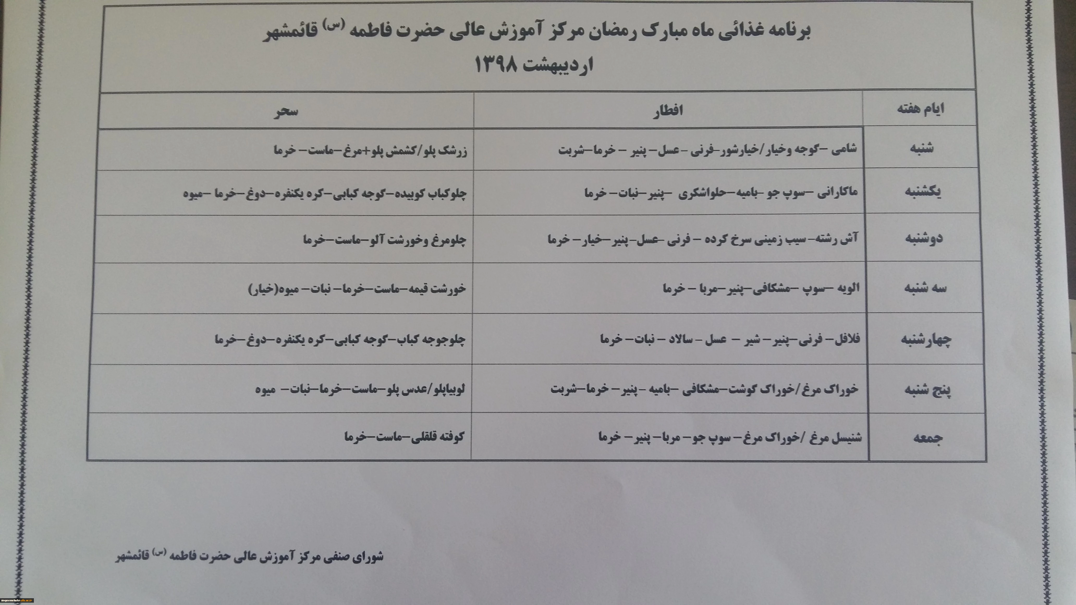 برنامه غذایی ماه مبارک رمضان مرکز حضرت فاطمه ()قائمشهر 1398 2