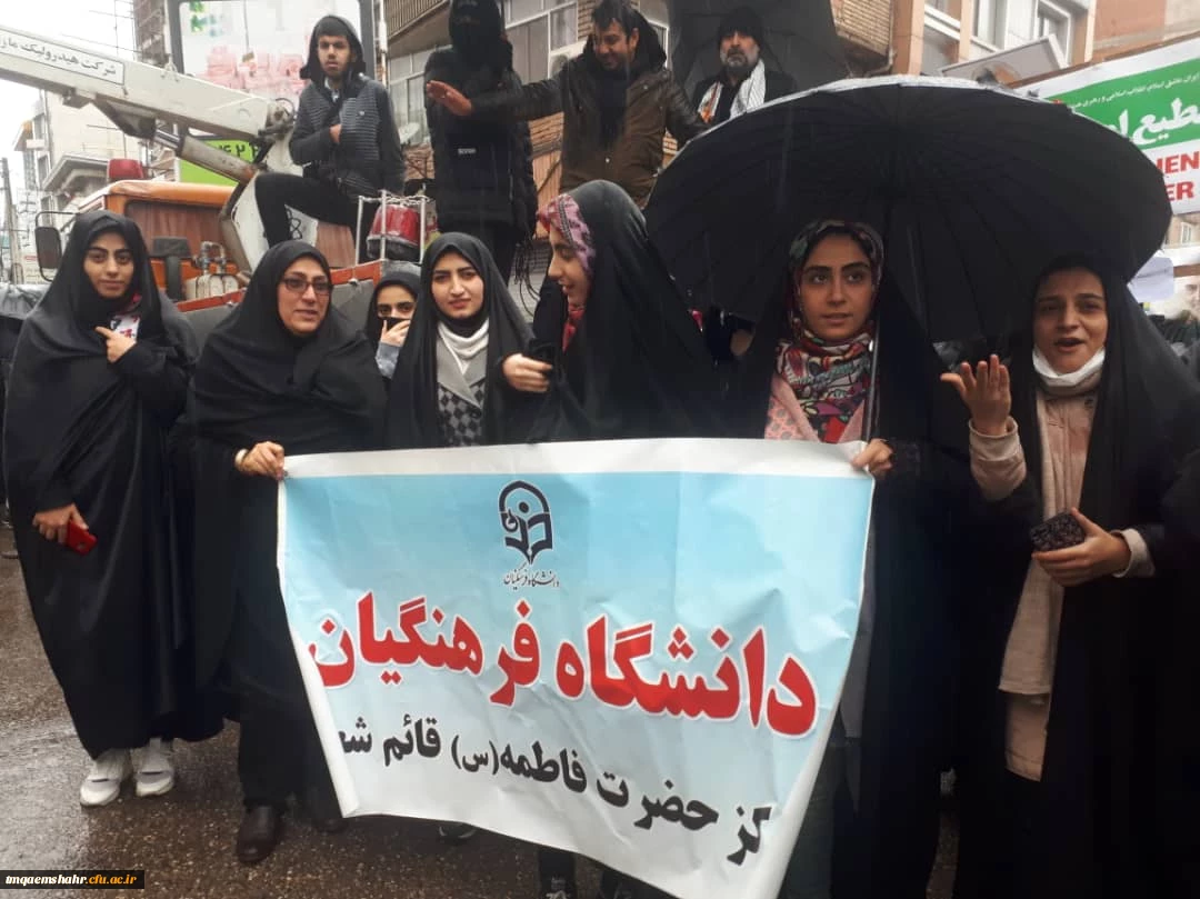 دانشجو معلمان مرکز اموزش عالی حضرت فاطمه (س ) قائم شهر همزمان با سایر هموطنان در راهپیمائی باشکوه 22 بهمن حضور پیدا کرده و با ارمان های مقدس امام خمینی (ره ) و رهبر معظم انقلاب تجدید میثاق نمودند .  2