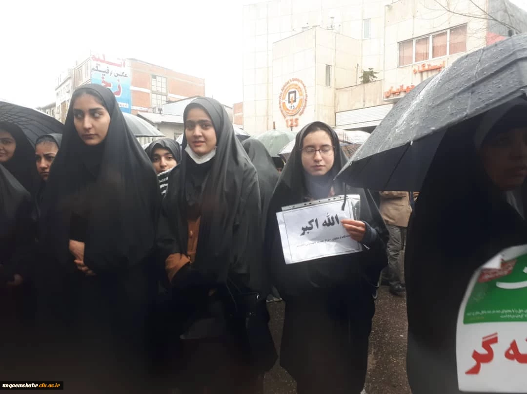 دانشجو معلمان مرکز اموزش عالی حضرت فاطمه (س ) قائم شهر همزمان با سایر هموطنان در راهپیمائی باشکوه 22 بهمن حضور پیدا کرده و با ارمان های مقدس امام خمینی (ره ) و رهبر معظم انقلاب تجدید میثاق نمودند .  2