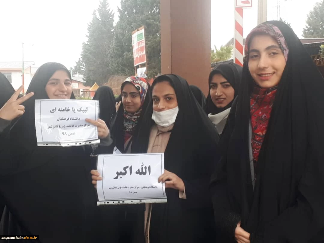 دانشجو معلمان مرکز اموزش عالی حضرت فاطمه (س ) قائم شهر همزمان با سایر هموطنان در راهپیمائی باشکوه 22 بهمن حضور پیدا کرده و با ارمان های مقدس امام خمینی (ره ) و رهبر معظم انقلاب تجدید میثاق نمودند . 2