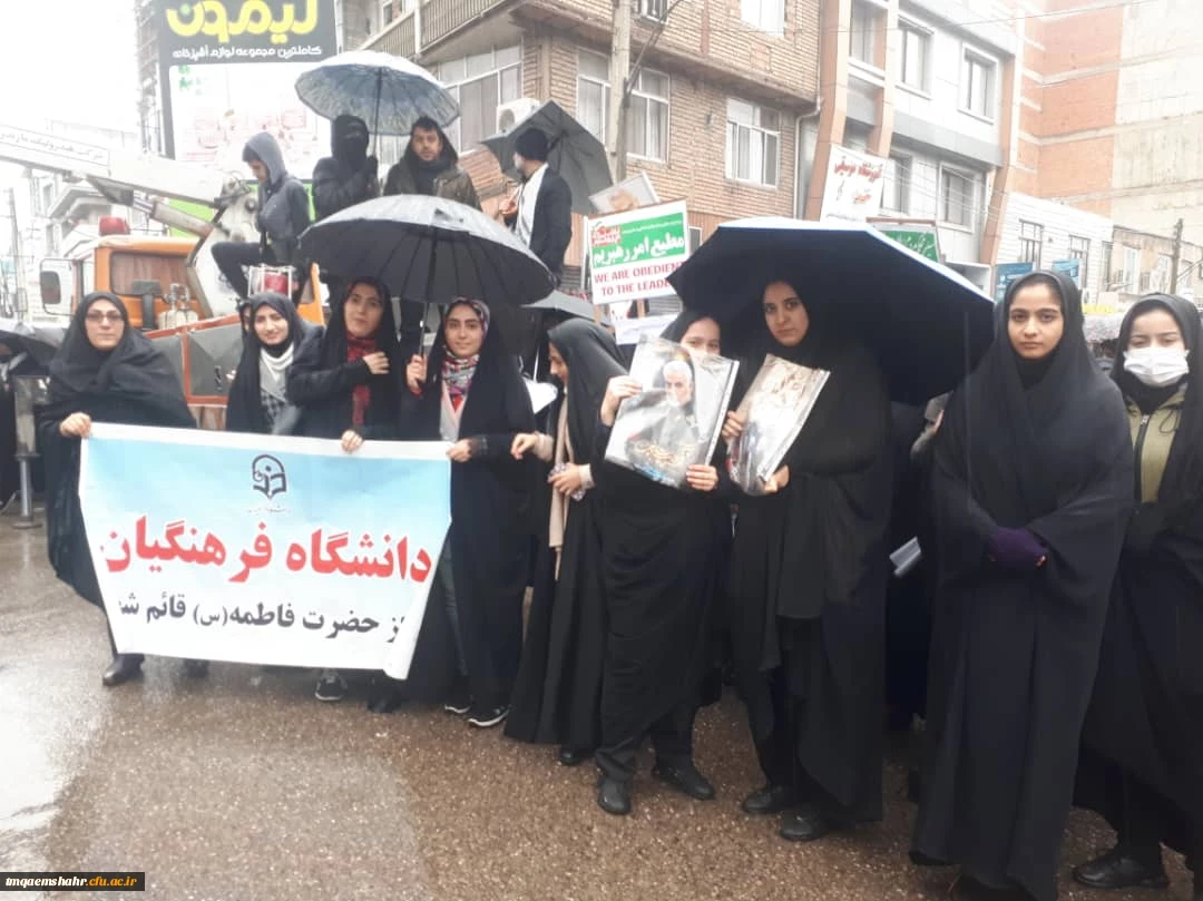 دانشجو معلمان مرکز اموزش عالی حضرت فاطمه (س ) قائم شهر همزمان با سایر هموطنان در راهپیمائی باشکوه 22 بهمن حضور پیدا کرده و با ارمان های مقدس امام خمینی (ره ) و رهبر معظم انقلاب تجدید میثاق نمودند .  2