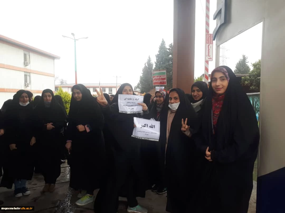 دانشجو معلمان مرکز اموزش عالی حضرت فاطمه (س ) قائم شهر همزمان با سایر هموطنان در راهپیمائی باشکوه 22 بهمن حضور پیدا کرده و با ارمان های مقدس امام خمینی (ره ) و رهبر معظم انقلاب تجدید میثاق نمودند . 2